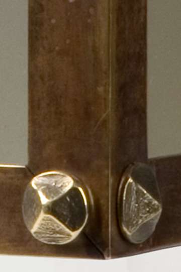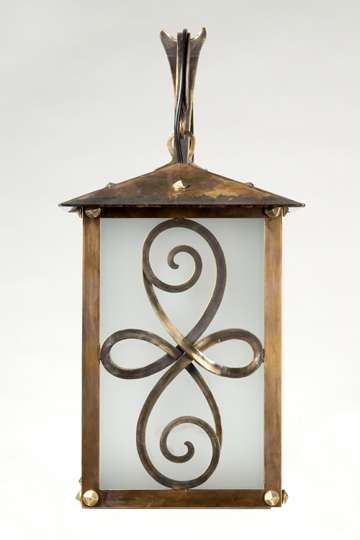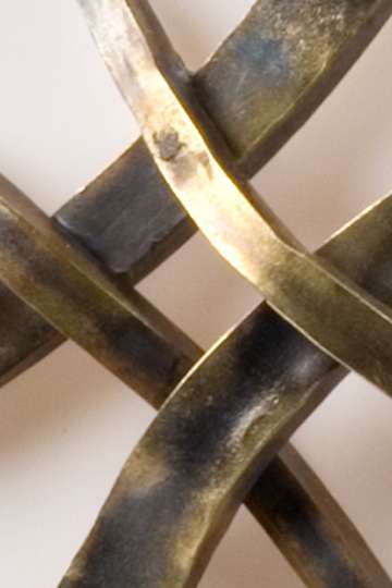 Bronze, eines der ältesten Metalle der Welt, edel verarbeitet in einen, nach den Seiten und nach unten leuchtenden, Lampenkörper mit einer im Zentrum öffnenden handgeschmiedeten Verzierung.